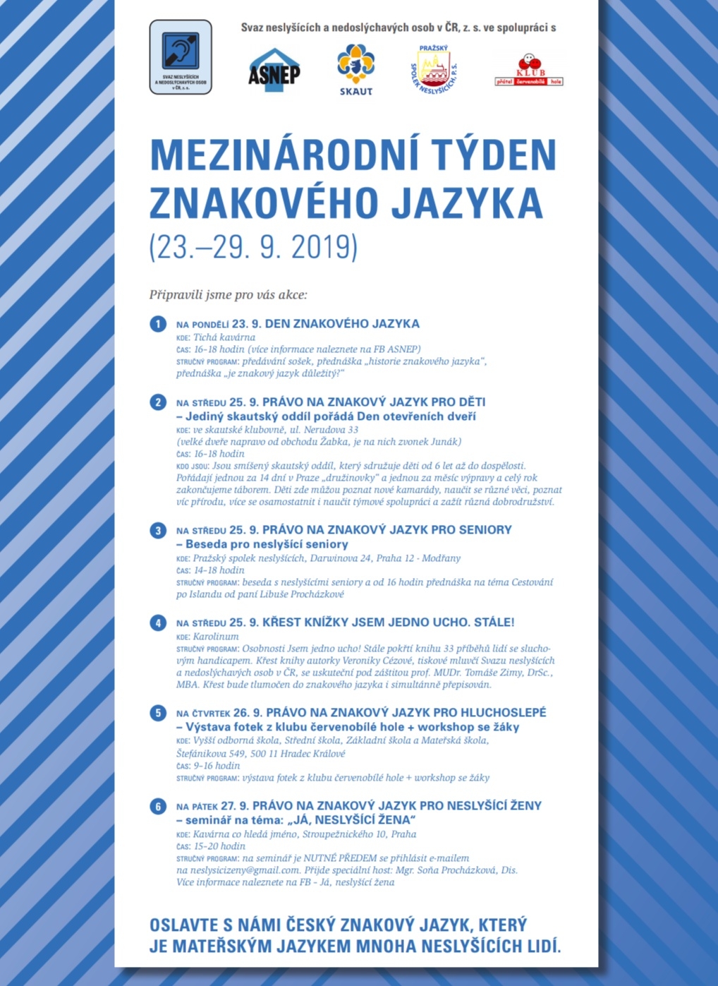 Ve dnech 23. až 29. září se uskuteční přednáška, den otevřených dveří, beseda, výstava, workshop, seminář i křest knihy Jsem jedno ucho.