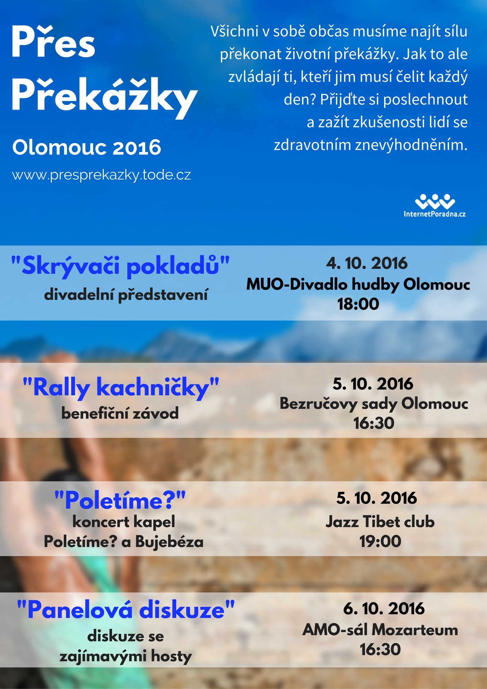 Zveme Vás na jedinečnou sérii událostí v Olomouci s názvem Přes překážky. Všichni v sobě občas musíme najít sílu překonat překážky v životě. Jak to ale zvládají ti, kteří jim musí čelit každý den? Přijďte si poslechnout a zažít zkušenosti lidí se zdravotním znevýhodněním. Více na www.presprekazky.tode.cz a https://www.facebook.com/presprekazkyOlomouc/