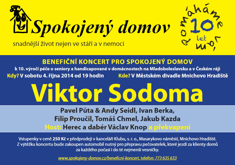 Spokojený domov byl původně coby občanské sdružení založen již v roce 2004 a letos si tedy připomíná 10 let své existence. Při této příležitosti připravuje benefiční koncert, který se uskuteční v sobotu 4. října od 19 hodin v Městském divadle Mnichovo Hradiště.