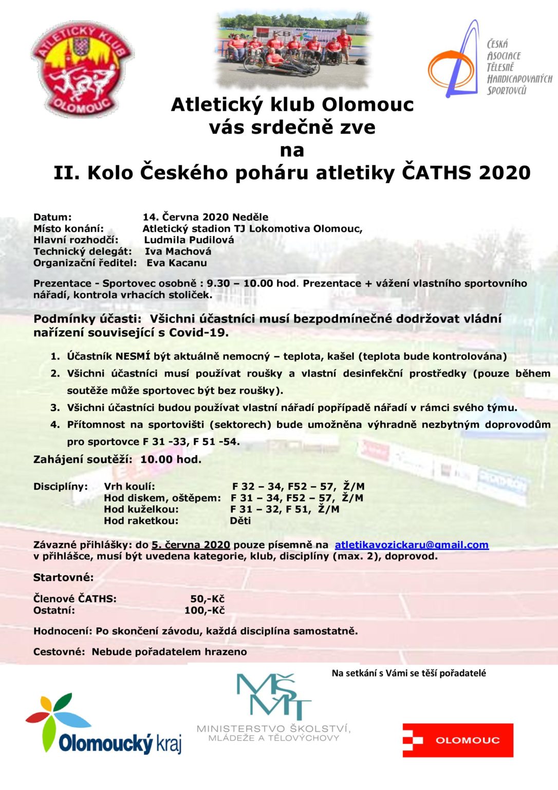 tímto Vás srdečně zveme na 2. kolo Českého poháru ČATHS v atletice. Stejně jako v kole prvním, i nyní zavítáme do města Olomouc, tentokráte v neděli, 14.6.2020.